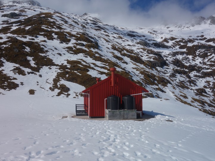 The last 300m to the hut was a trudge on and off the track as there was still some crunchy snow around, but luckily the people before had boot packed through it so it was easy going to the hut.