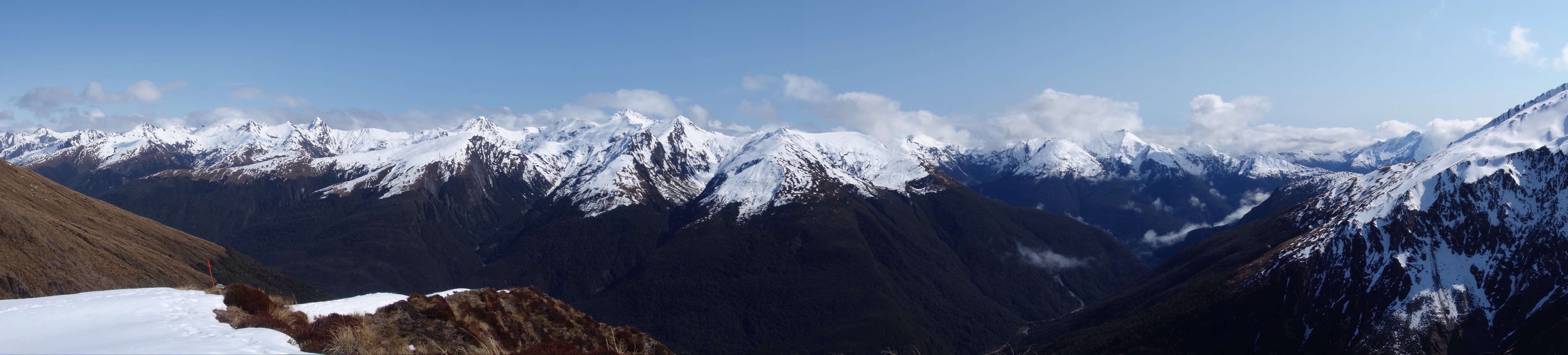 Breaking out of the bushline into the tussock, a stunning view of the surrounding peaks is seen across the valley. Below, you can make out the winding road and river snaking its way to the west.