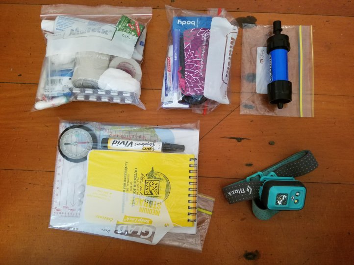 Other useful items like dental floss and a needle, and repair patches and tape for gear upkeep, waterproof matches and a headlamp.