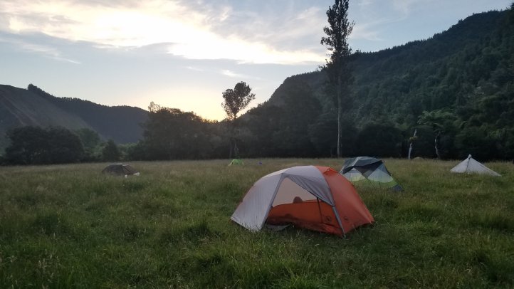 Finally we came around the corner and saw Hipango park, a sweet as campsite with a shelter and toilets, and once all the barrels had been lugged up there we enjoyed a nice evening with more hikers and lots of food.