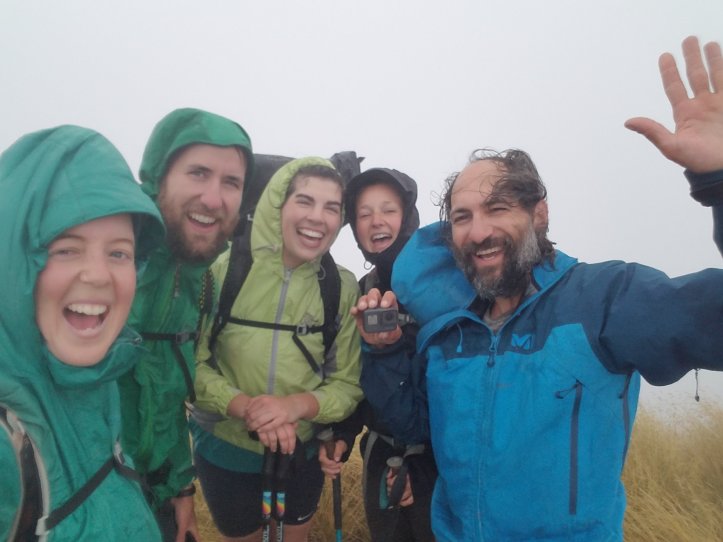The morning brought wind and a bit of rain but the wind was looking to be dying down so I packed up and got going with Iben, Ralph, Laine and Casey, as it was a safety in numbers exercise on the ridge in wind and poor visibility.