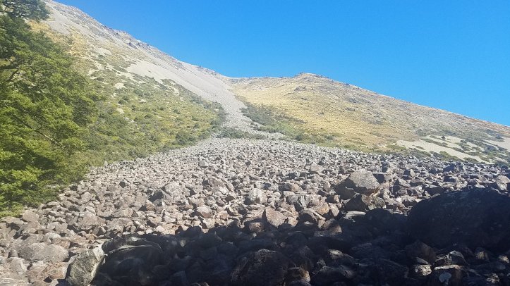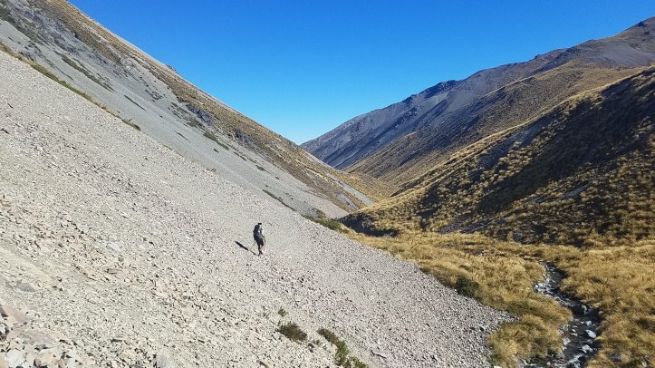 Followed the sparse marker poles up and down steeply to the stream down some scree slopes.